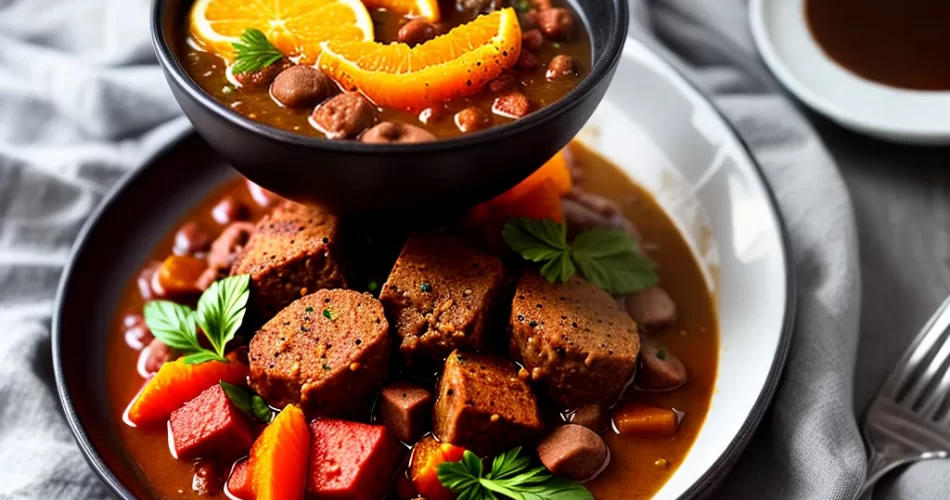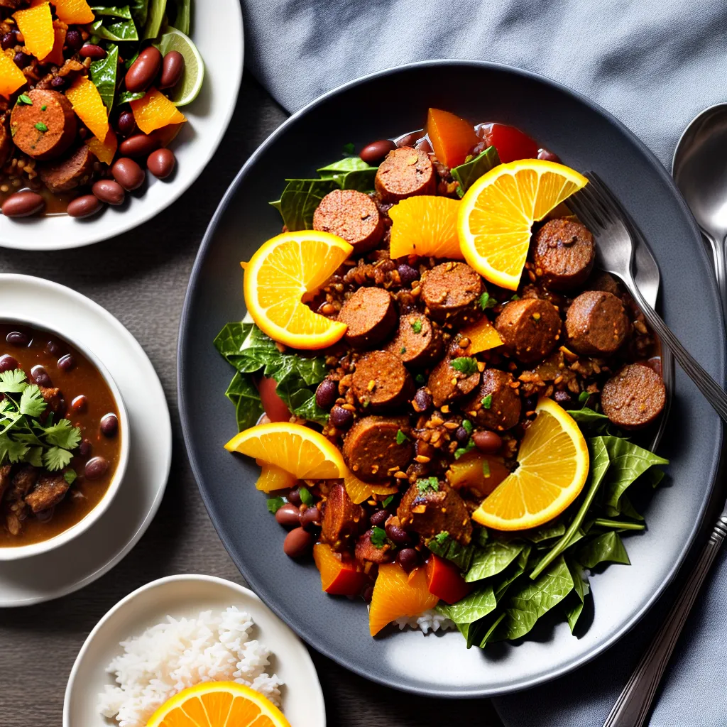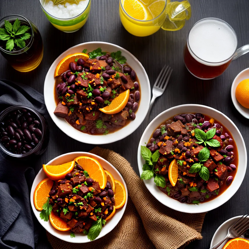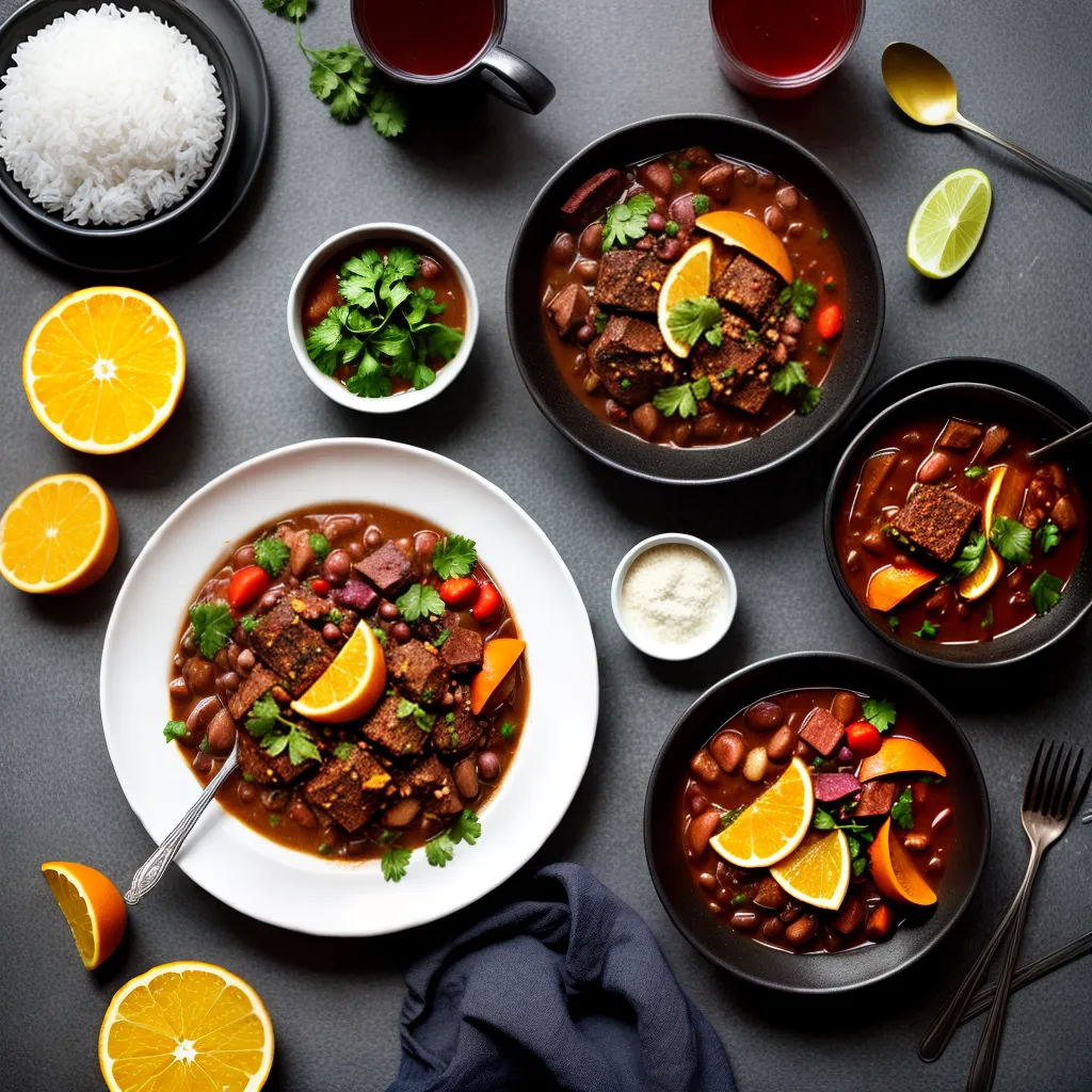 – Feijoada: prato típico brasileiro, composto por feijão preto cozido com carnes diversas, acompanhado de arroz, couve e laranja.