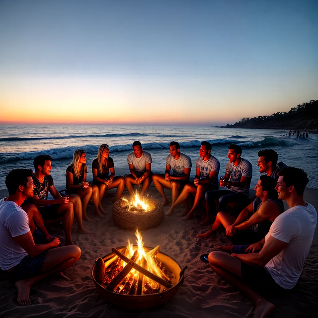 Verifique as regras locais sobre fogueiras na praia e siga todas as precauções de segurança. Use madeira seca e não tóxica e mantenha um balde de água por perto para emergências.